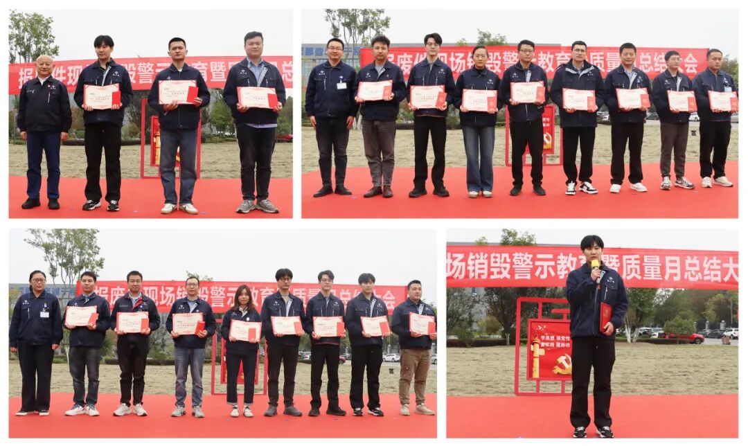 为强化全员质量意识,筑牢质量防线,公司组织公司全体干部员工召开报废件现场销毁警示教育暨质量月总结大会。